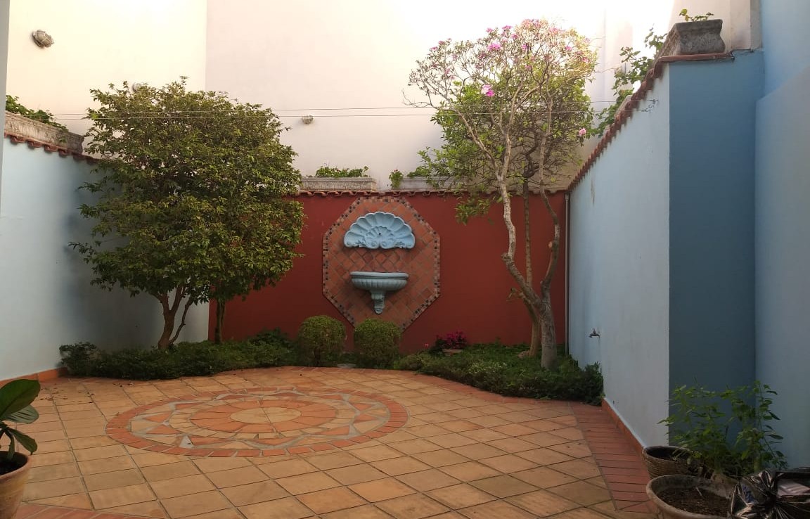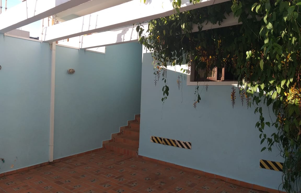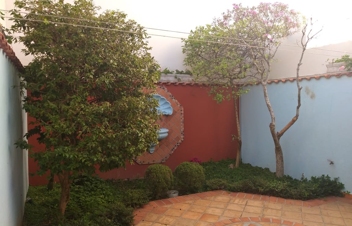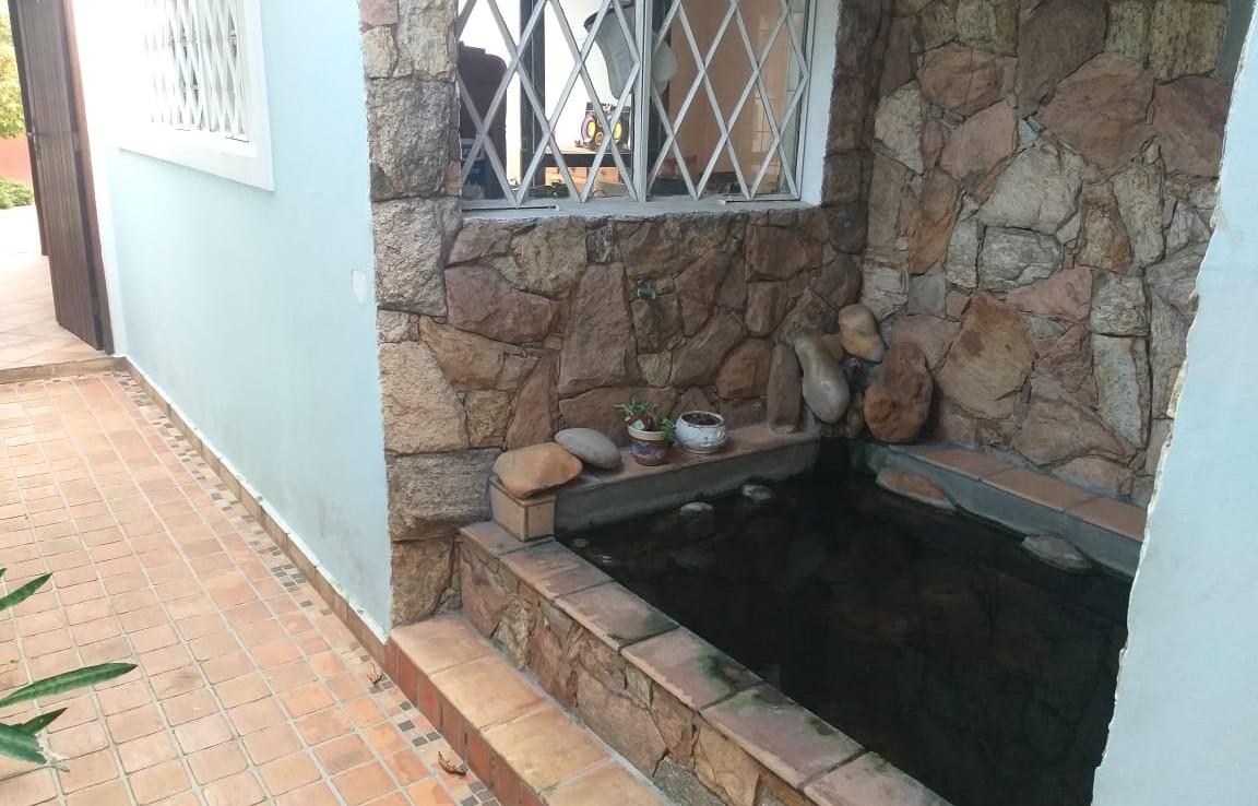 – Uma área verde nos fundos, com fonte na parede, jabuticabeira e limoeiro produzindo frutos, 2 pés de manacás e flores diversas;