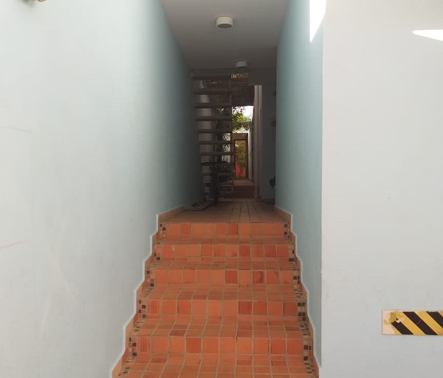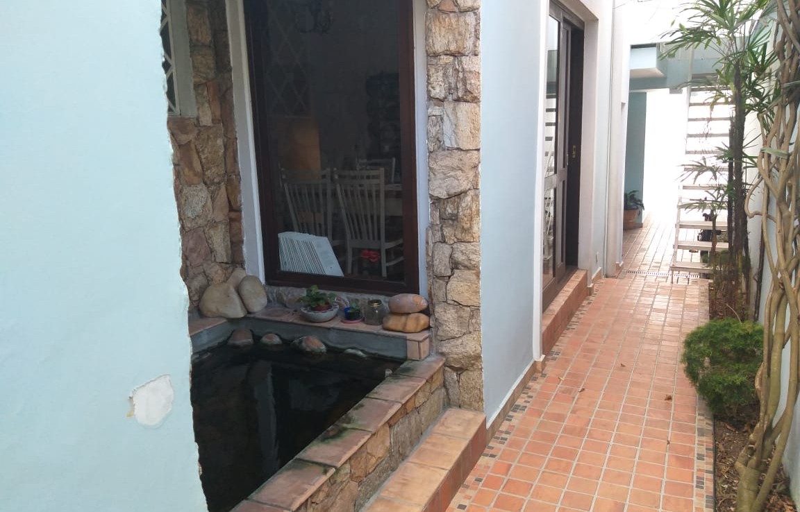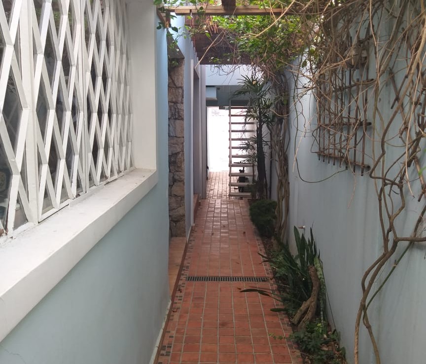 – Um corredor lateral com plantas, pergolado, tanque de carpas e acesso aos fundos da casa e ao sótão (3º andar);