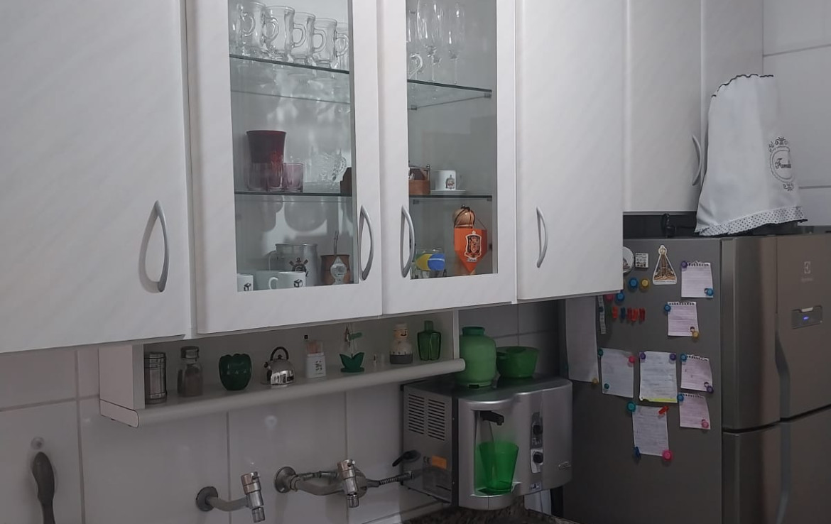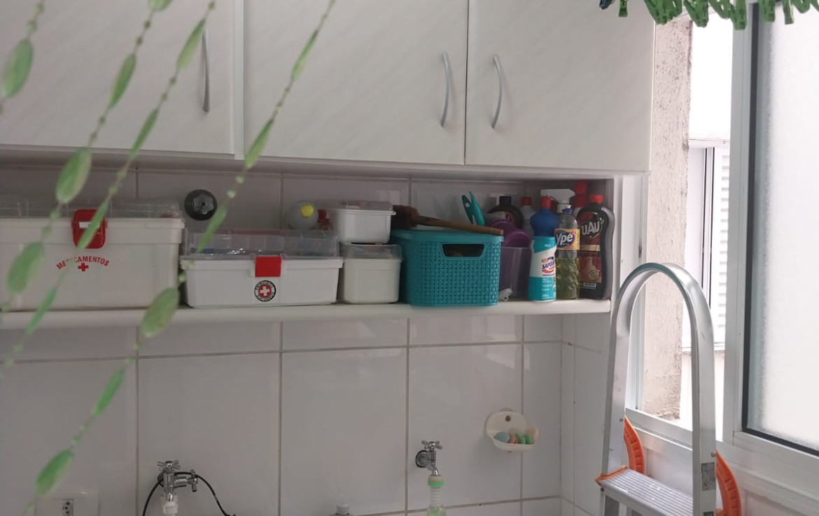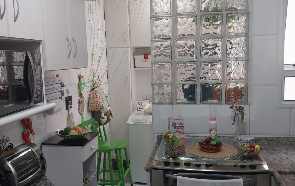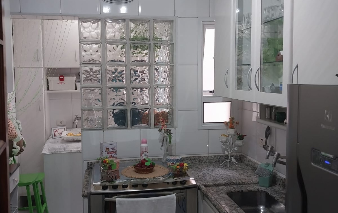 O apartamento está bem equipado com cozinha funcional, móveis planejados e fogão e área de serviço com armários.